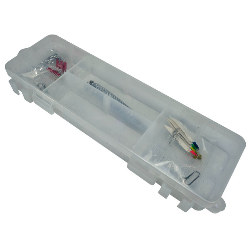 Everything you need to catch yourself some inshore summer species, just add some casting weights! Coming complete with a sturdy rod rated to 60-120g casting weights and a 6000 reel pre-loaded with 15lb line. A clip-lock tacklebox contains two sets of feathers and a 60g stinger lure, ideal for targeting the bass too.