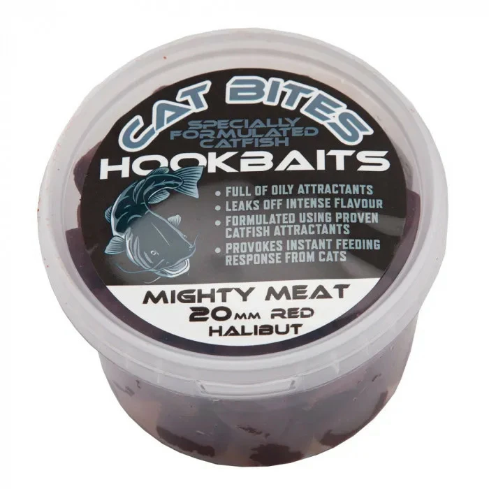 Bait-Tech’s Cat Bites in Mighty Meat, gobstopper 20mm sized high oil hookbaits effective straight from the pot. Absolutely packed with high leakage oils, powerful flavourings and pre-drilled. Designed by the team at bait tech to continue to release that taste and aroma over an extended period of time, and still fish effectively after hours in the water. Available in red and black colour options.