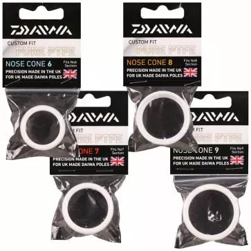 Daiwa Custom Fit Nose Cones, designed to offer protection for the ends of your sections. Made from a pure virgin PTFE that will enhance the performance of your pole with speed of section assembly and elastic travel.