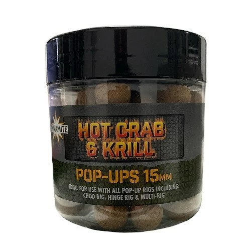 Dynamite Baits Hot Crab & Krill Food Bait Pop-Ups with a top quality fishmeal base containing a winning combination of top quality premium ingredients. Sourcing Antarctic krill, shellfish meal and blending in a hint of chilly for that extra kick. A bait that’s proved highly effective in testing and available in 1Kg and 1.8Kg bag sizes. A matching liquid food attractant and bottom bait boilies are also available. Â