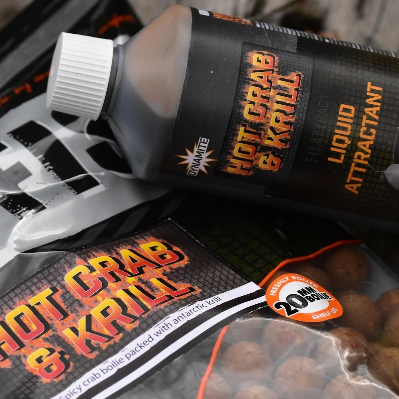 Dynamite Baits Hot Crab & Krill Liquid Attractant, a highly pungent concentrated bottle that perfectly compliments the matching bait range. Containing all the premium ingredients as the rest of the bait range including specially sourced Antarctic Krill. Its a great way y to add a boost to pellets, hookbaits, groundbait and spod mixes. Its also 100% PVA friendly and will add a powerful kick to your bag and stick mixes.Â