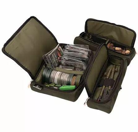 - A fantastic storage bag that has three interlocking padded pouches that are ideal for safely transporting terminal tackle, leads or other angling essentials like buzz bars, banksticks and accessories. You can also use either as a set, or simply unzip each one individually if travelling light. There is a large padded base, plus two removeable pouches which have slightly varying features.