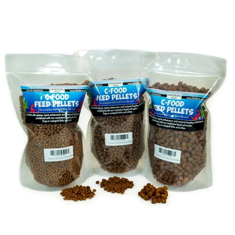 Hinders C-Food feed pellets contain a unique blended fishmeal combined with a two phase liquid attractant. This ensures a a fast instant release of flavour, followed by a second stage that leaches out more attraction over time. A great option for putting down a carpet of bait that will keep carp occupied while searching for the smaller particle size. Also excellent for making up PVA bags   Â