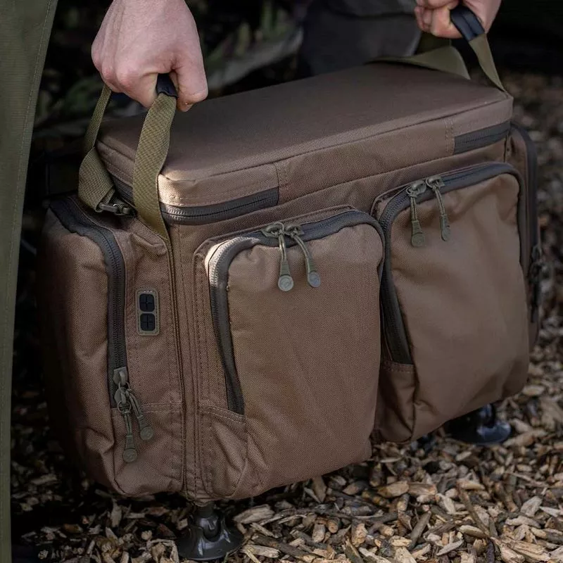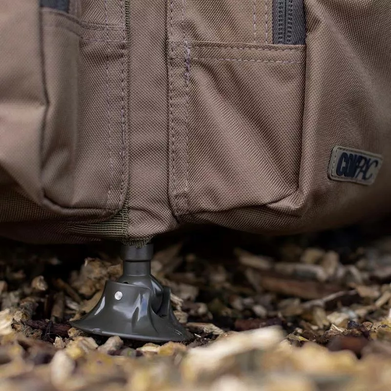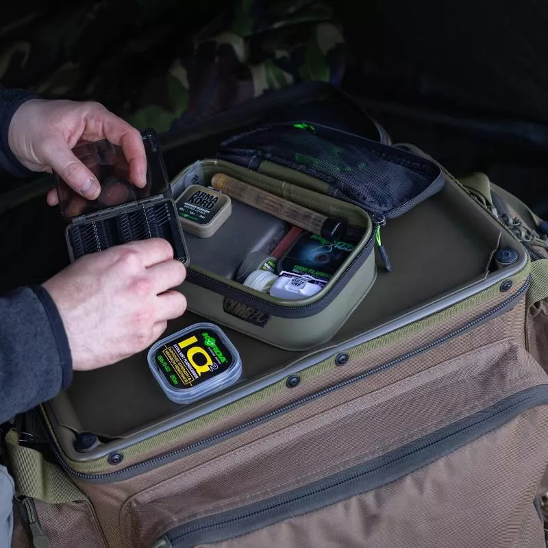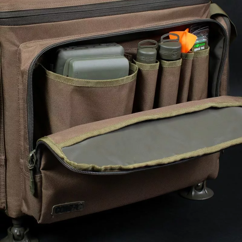 Korda Compac Framed Carryalls, available in two sizes and offering an impressive amount of storage space with a super strong reinforced frame that extends out of the base with four individual ball headed feet so they can be set down on just about any surface. The inner frame keeps the bag and main compartment fully open and features a metal lid that gives a usable work surface for rig building plus an additional storage compartment that zips over and seals everything in place. On the exterior you get three zipped outer pockets, all with a variety of pockets and pouches inside.Â