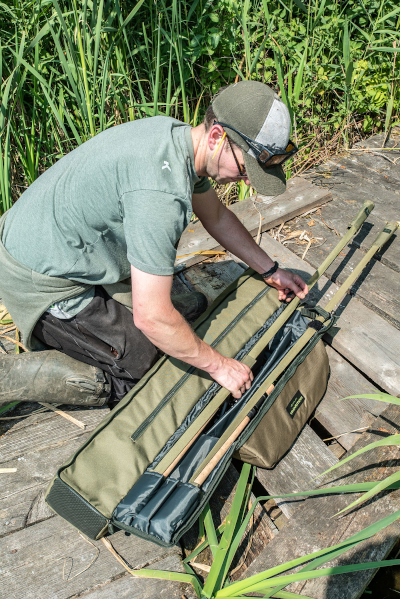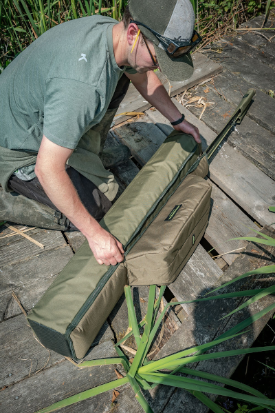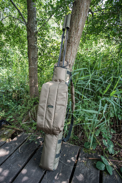 Take up to three made up outfits ready to go, along with all your bankwear and shelter along with you. Designed to take any shelter in the range, the large main compartment is separated from the others and closes with a drawstring top. The pouch for taking your outfits is padded and zipped but the tops remain out. There’s also a third outer side pocket for taking any landing net handles and bank sticks you might need.Â