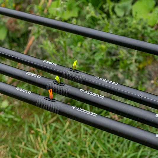 The Matrix MTX1 V2 13m Pole Package, developed as a complete all round package offering everything you need for tackling todays commercial venues. Manufactured from specially selected Japanese carbon fibre and featuring MST layering technology, Glide tape finish and Reinforced 1k carbon weave joints. Built using the same mandrel as the rest of the MTX range so all the sections and spares are fully interchangeable. All the top kits supplied come pre bushed and fitted with Matrix Revolve side kits fitted. Plus your no 3 and 4 sections come with protective bungs that prevent any accidental damage when your breaking down to land a fish.