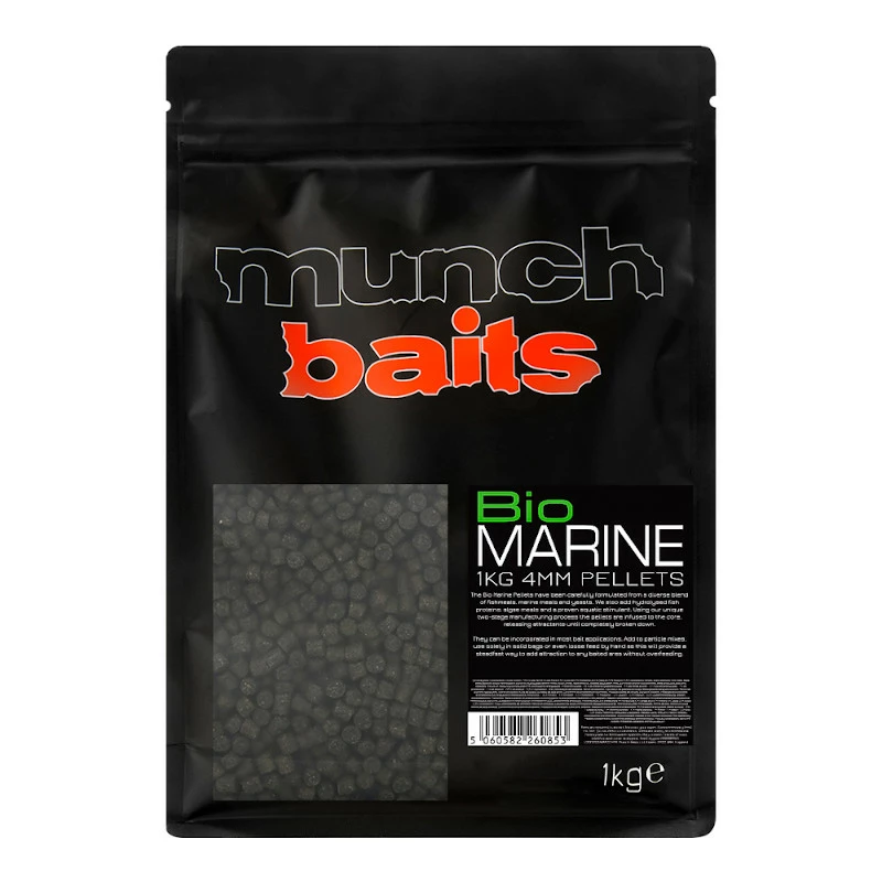 The Munch Baits Bio marine pellets, a fishmeal based bait with some key additions that really sets it apart from the crowd. Designed to keep you catching in all seasons with a balance of marine based ingredients that offers a recognised food source throughout the year. They achieve this with a combination of a unique cultivated algae, a singled celled yeast plus aquatic stimulants. Not merely coated, this is all blended into the mix giving you a bait that continues to release exceptional flavour as they break down. Â