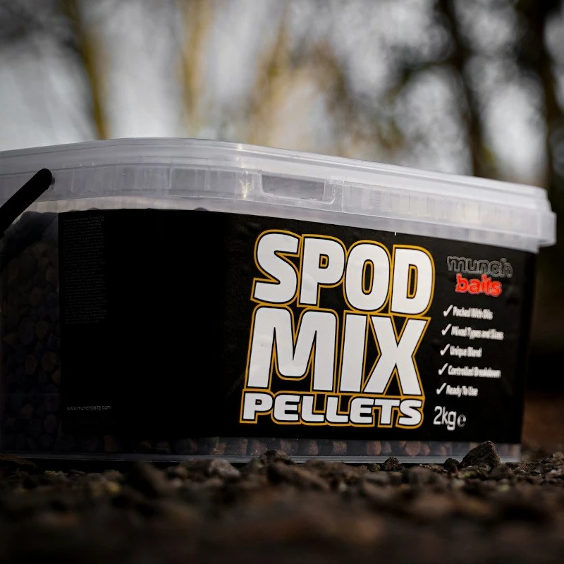 Munch Baits Spod Mix Pellets, packed with oils and attractants and a blend of different sizes. With a mixture of pellet types giving you a varied breakdown over time, ensuring a constant release from the moment they hit the water. Can be used on their own straight from the pack, or blended into your own spodmixes.Â