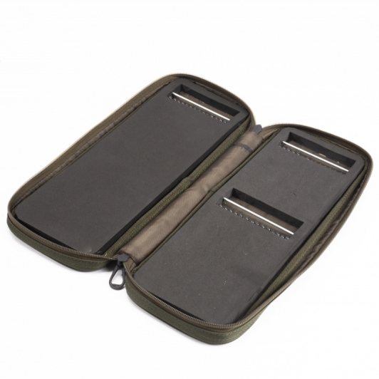 Make up and store your hooklengths in advance with one of these clever wallets. Simply unzip and open in two to reveal both sides of the high density foam backing with 42 pins to locate and secure your hooklengths etc. When folded together again, theres enough room so the opposing sides don’t squash and straighten any angled shrink tubing.