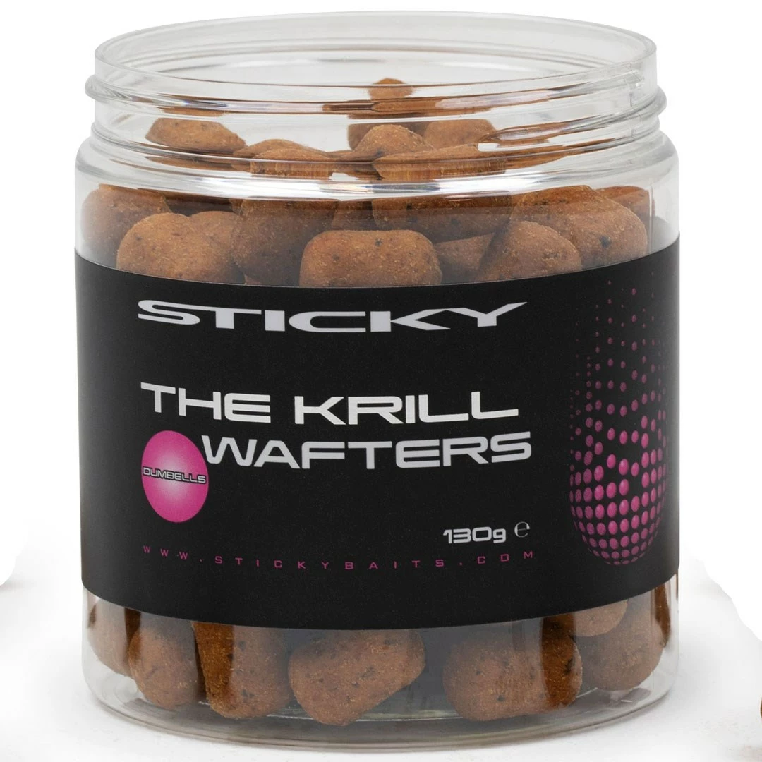 Sticky Baits The Krill Dumbell Wafters, based on the popular Krill boilie range, these 16mm critically balanced baits have just enough buoyancy to counteract the weight of your hook. Giving near perfect presentation. Use with the matching bait glug available to further boost attraction.