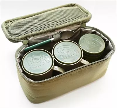 - A complete bankside hot drink kit supplied with two plastic cups, a teaspoon and three translucent pots ideal for tea coffee and sugar. All this is stored inside a foil-lined carry pouch with a zipped mesh lid.